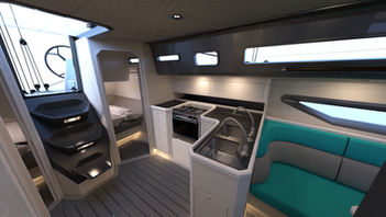 While speed and performance are at the heart of the Shogun 43, style and comfort are a priority. The interior, built in carbon and oak veneer to be exceptionally light, provides a a cosy and welcoming feel. The standard layout has three double berth cabins (one in the bow and two aft) and has the salon table placed center forward with the mast situated aft of the table. Two couches stretch along either side of the table, with an L-shaped galley on the port side opposite a spacious bathroom to starboard.